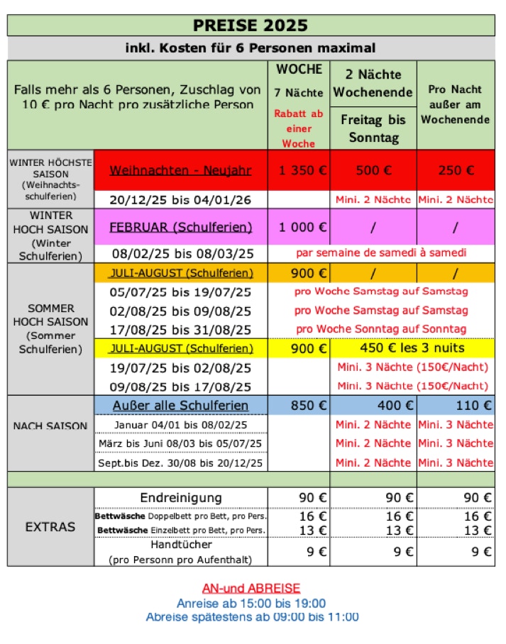 Vor Ort, bei der Übergabe der Schlüssel ist eine Sicherheitskaution in Höhe der Endreinigung zu hinterlegen (Preis gemäss Preisliste - Extras).
