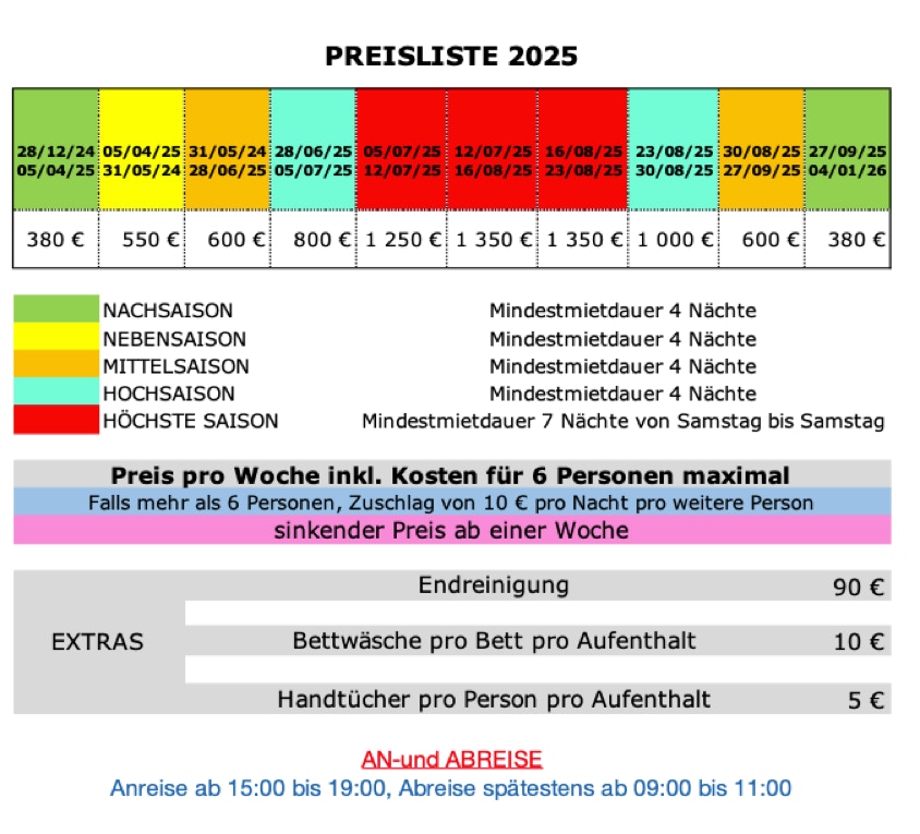 Der Empfang und die Übergabe der Schlüssel, der Zustandsbefund sowie die Abfahrt werden durch eine Person vorgenommen die vor Ort kommt. Die Namen und Adresse dieser Person werden Ihnen bei der Reservierung übermittelt.