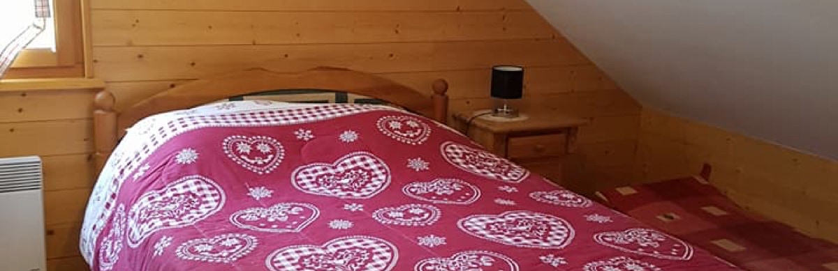 - Chambre avec lit double de 140 et armoire, pour 2 personnes au 1e étage (fenêtre de toit, hauteur en partie < 1,80m)