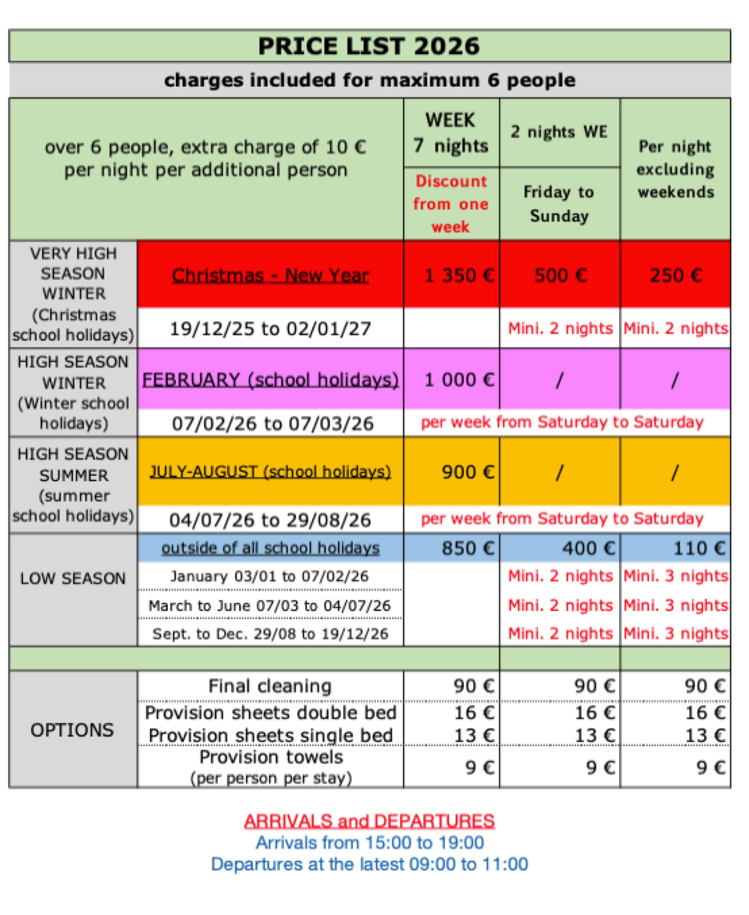 A security deposit in the amount of the final cleaning is to be paid on site in cash when the keys are handed over (see price list, options).