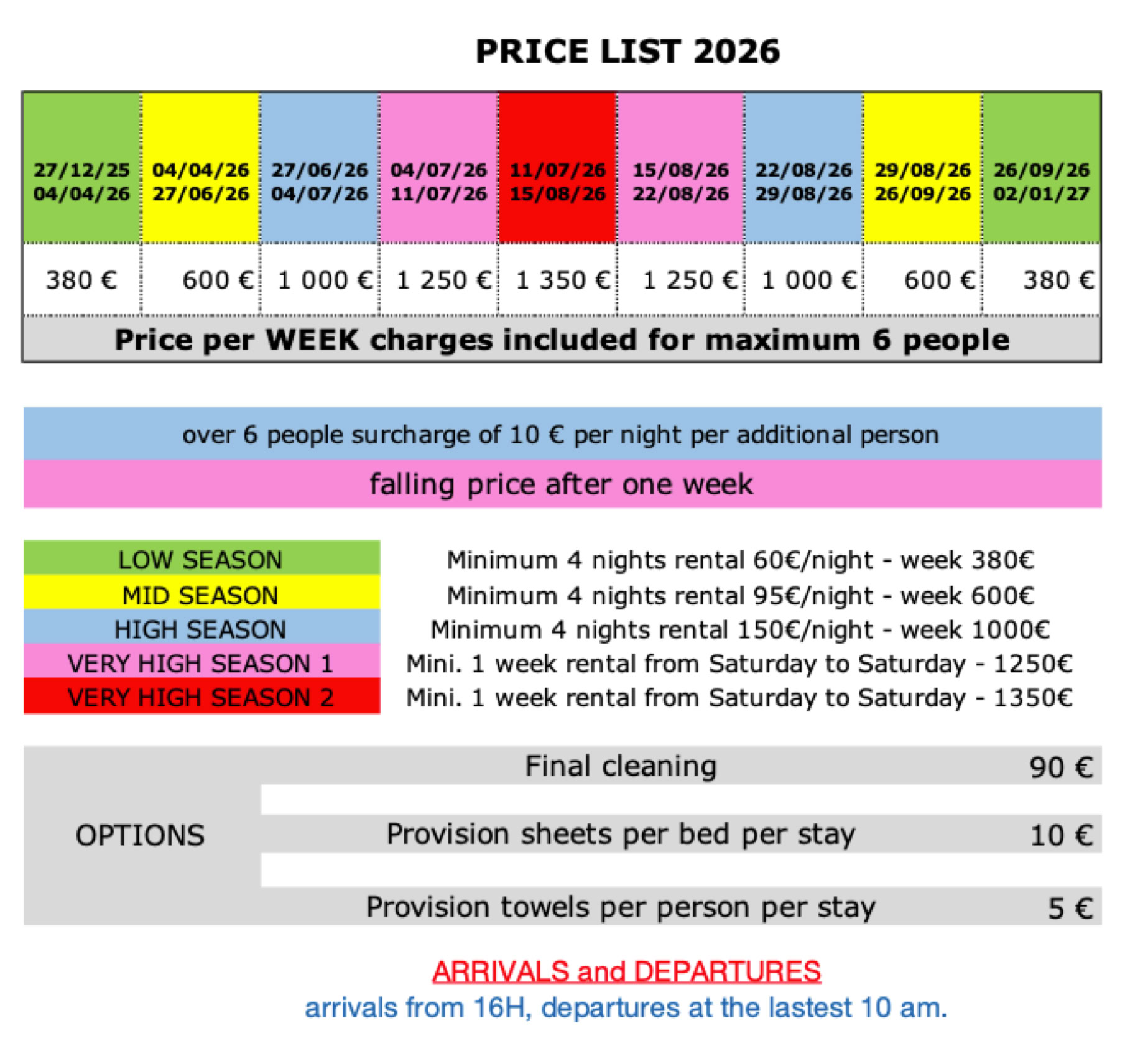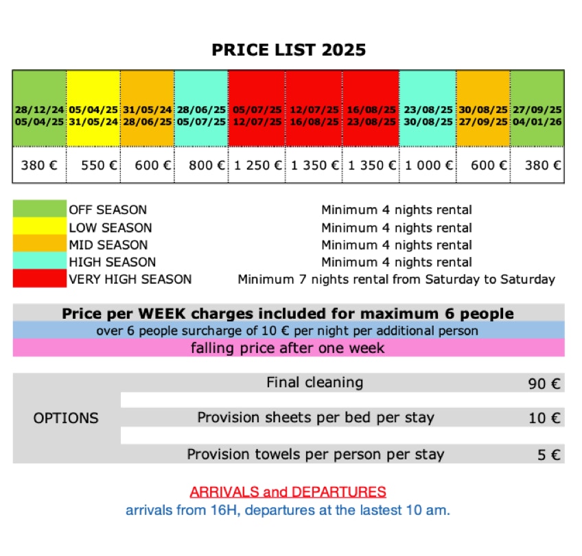 The accommodation must be perfectly cleaned by the tenant. Otherwise, the final cleaning must be paid cash on the spot in addition to the rental price (see price list options)